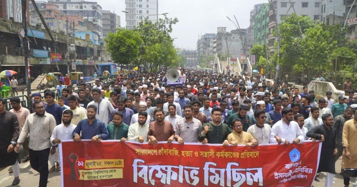একটি রাজনৈতিক দল ক্ষমতা গ্রহণের আগেই দেশজুড়ে চাঁদাবাজি, খুন এবং ধর্ষণ শুরু করেছে বলে মন্তব্য করেছেন বাংলাদেশ ইসলামী ছাত্রশিবিরের নেতৃবৃন্দ। তারা বলেন, দেশের মানুষ খুনি, ধর্ষক ও চাঁদাবাজদেরকে ক্ষমতায় দেখতে চায় না। শনিবার (১২ জুলাই) সারাদেশে চাঁদাবাজি ও সন্ত্রাসী কর্মকাণ্ডের প্রতিবাদে ঢাকা মহানগর দক্ষিণ শাখা ছাত্রশিবিরের উদ্যোগে আয়োজিত বিক্ষোভ মিছিল শেষে এক সমাবেশে নেতারা এসব কথা বলেন।